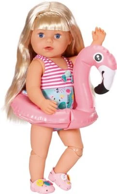 Reif für den Sommer und reif für den Strand. Das ist BABY born allemal! Jetzt fehlt nur noch die passende Erstausstattung für den Beach! Kein Problem, denn mit diesem Set von Zapf Creation erhält sie einen Badeanzug mit schickem Flamingo-Print und süßen Rüschen an der Seite. Ein farblich abgestimmtes paar Badeschuhe darf natürlich auch nicht fehlen. Jetzt nur noch schnell den Schwimmreifen aufpusten und schon kann es ab ins Wasser gehen.