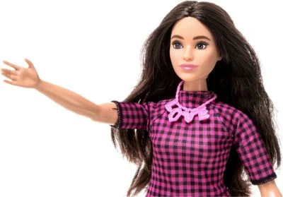 Diese Mattel Barbie Fashionistas Puppe trägt ein trägt ein hochgeschlossenes pink-schwarz-kariertes Kleid. Die Ärmel und der Saum sind mit einer schwarzen Paspel eingefasst. Ihre langen schwarzen Haare sind elegant und der perfekte Kontrast zur auffälligen, pinken Love-Halskette. Der moderne aber dennoch verspielte Look wird durch die pinken Sneakers vervollständigt