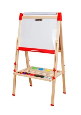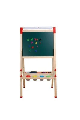 Maxi Standtafel mit Ablage und massivem Vollholzrahmen weiße magnetische Seite für Filzstifte und Buchstaben (Magnettafel) grüne Seite zum Malen mit Kreide (Maltafel) Papierrolle zum Zeichnen (Flipchart / Whiteboard) 1 Whiteboard-Marker 1 Markerschwamm 4 Wasserbehälter mit farbigen Deckeln 12 farbige Kreidestifte 52 bunte magnetische Buchstaben, Zahlen und Zeichen Sicheres Spielzeug Detaillierte Montageanleitung Abmessungen (B x H x T): 56 x 128 x 50 cm