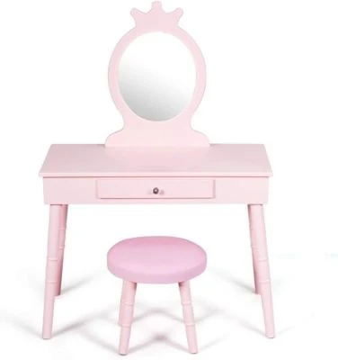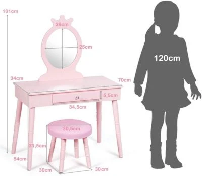 Fragen Sie sich, was Sie Ihren Kindern zum Geburtstag oder zu Weihnachten schenken sollen? Unser weißes Waschtisch-Set ist das perfekte Geschenk für kleine Mädchen. Das ganze Set ist aus dichten Brettern und Kiefernholz gefertigt, sehr stabil und kann lange Zeit verwendet werden. Darüber hinaus sorgen die runden Ecken und rutschfesten Unterlagen für die Sicherheit der Kinder. Das mit bleifreier Farbe lackierte Set hat keinen eigenartigen Geruch und beeinträchtigt die Gesundheit der Kinder nicht. Die Kommode hat auch eine Schublade, in der kleine Gegenstände wie Haargummis, Bürsten, Make-up, Nagellack und andere Dinge aufbewahrt werden können. Darüber hinaus bietet der Hocker des Sets dem Kind mit seinem weichen und dicken Kissen ein bequemes Sitzerlebnis. Kaufen Sie noch heute unser Set und bereiten Sie Ihrer Kleinen eine große Freude!