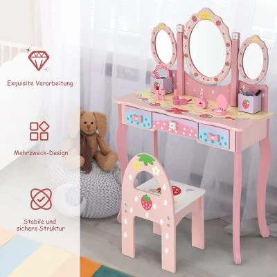 Dieses Set mit klappbarem Spiegel ist eine wundervolle Ergänzung für Kinderzimmer.Die exzellenteMDF-Konstruktion bietet Ihnen Stabilität und Sicherheit.Auf der großen Oberseite und in den 3 Schubladen ist viel Platz für alle möglichen Gegenstände.Zwei Teile des Spiegels können zudem eingeklappt werden, wodurch er sehr praktisch ist.Natürlich können Sie ihn auch vollständig abnehmen und den Tisch dadurch in einen Schreibtisch verwandeln. Sollten Sie noch nach einem solchen Set suchen, dann schlagen Sie jetzt zu!