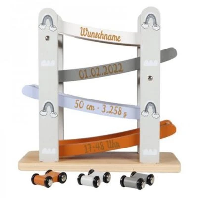 • Mini Autobahn Rennstrecke mit 3 Fahrzeugen aus Holz zum Spielen