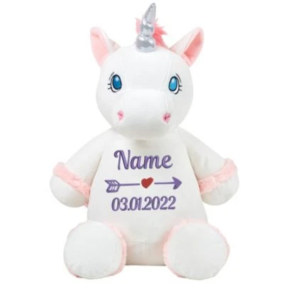 • Die personalisierte Stickerei erfolgt auf den Bauch des Einhorns und macht das Kuscheltier zum Unikat
