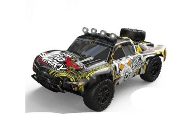 komplett montiert und sofort einsatzbereit geeignet ab 14 Jahren 9G Servo für proportionale Lenkung Karosserie aus crashsicherem Lexan 4×4 Allradantrieb luftgefüllte Gummireifen Geschwindigkeit: bis 35-40 km/h Stoßdämpfer Profi-Pistolenfernbedienung 2,4 GHz vollproportional Bewegungsrichtungen: vorwärts, rückwärts, rechts, links Lenkung und Gas an der Fernbedienung einstellbar
