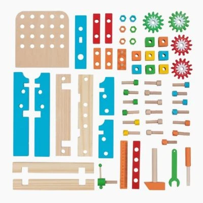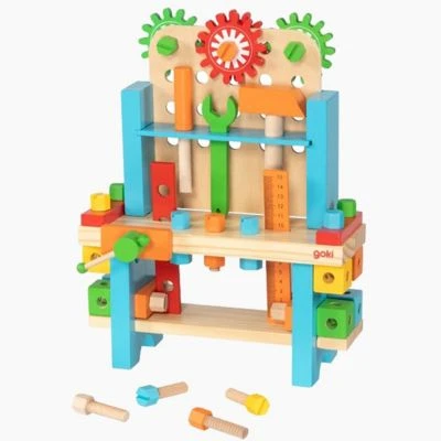 Heimwerker aufgepasst! Diese Werkbank aus Holz ist bestens ausgestattet: mit Werkzeugen wie Hammer, Schraubenschlüssel und Schraubendreher können Formen zusammengesetzt und wieder auseinandergenommen werden, Werkstücke eingespannt und Teile vermessen werden. Ein Traum für jede kleine Handwerkerin und jeden kleinen Handwerker. Der Phantasie sind dabei keine Grenzen gesetzt und nebenbei werden spielerisch Farben und Formen erlernt. Wir sind gespannt auf eure Bauwerke! Kinder können dabei ganz spielerisch ihre Eltern beim Handwerken unterstützen; das fördert ihre Kreativität und den Umgang mit Werkzeug. Welche Schraube soll jetzt festgezogen werden?