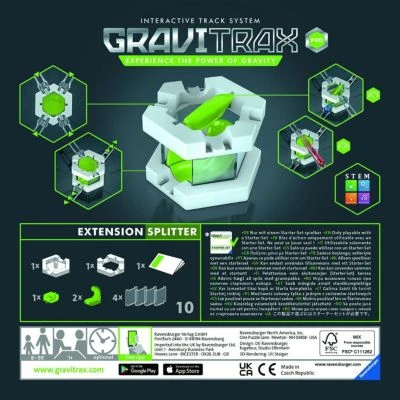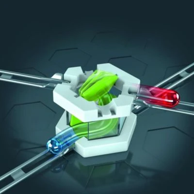 Mit dieser Erweiterung geht es auf der spektakulären Murmelbahn ab! Mit dem „GraviTex Splitter“ können alle Konstrukteur*innen und Baumeister*innen die eigene Bahn noch spektakulärer gestalten. Ist die Kugel schnell genug oder fällt sie durch die Klappe? Die Kugel kann von bis zu vier Seiten auf den Splitter zurasen. Je nach Geschwindigkeit und Klappenstellung wird die Kugel entweder über den Action-Stein herüber sausen oder durch die Klappe fallen. Was passiert?