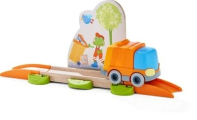 Einmal in der Woche fährt das große Müllauto durch Kullerbü, öffnet seine Heckklappe und sammelt den Müll ein. Das geht immer ruck, zuck, denn dank des Schwungmotors fährt das Müllauto schnell von Haus zu Haus. 1 Kulisse Müllabfuhr, 1 Müllauto, 1 Gerade, 2 Abfahrtsrampen, 2 Verbindungselemente, 1 Kulissenklemme. Material: Buche, Sperrholz, Kunststoff. Maße: Müllauto L 9 x B 5,7 cm.
