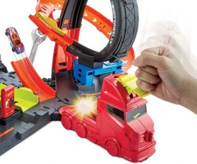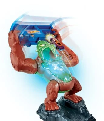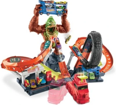 Die riesige Hot Wheels Rennbahn “City Slam Gorilla” sorgt für jede Menge actionreichen Fahrspaß! Die Strecke mit vielen Besonderheiten, Looping und coolem Design lässt Kinderherzen höher schlagen und der große Gorilla macht jede Fahrt zur Herausforderung. Das Biest kann auf drei verschiedene Arten besiegt werden – doch Vorsicht! Verfehlt man, wird der Gorilla wütend und frisst den Rennwagen. Hat die Attake geklappt, läuft er blau an und kippt um.