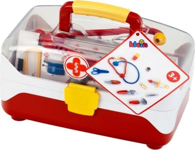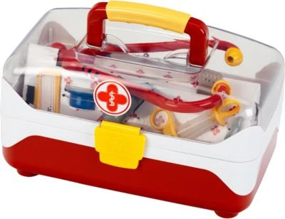 Schnell, ins Untersuchungszimmer! Der Teddy ist krank und muss behandelt werden. Aus dem transparenten Koffer können die Kinder die Instrumente nehmen, mit denen sie ihre Patient*innen untersuchen: Stethoskop, Reflexhammer, Schere, Pinzette, Thermometer und Otoskop. Ist die Krankheit festgestellt, wird mit der Spritze die richtige Medizin verabreicht oder eine Pille aus dem Pillendöschen gegeben. Noch schnell ein Rezept ausstellen und den Behandlungsplan aufschreiben, dann kann der Teddy wieder nach Hause. Mit diesem Koffer gibt es nur noch glückliche Patient*innen!