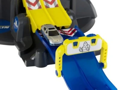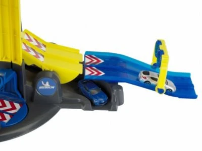 Das Parkhaus aus hochwertigem Kunststoff im Michelin-Design hat vier Ebenen, die ein Aufzug verbindet. Über die doppelte Abfahrtsrampe könne die zwei Autos (im Lieferumfang enthalten) sich beim Herunterfahren ein rasantes Rennen liefern, über die Wippe und Sprungschanze fahren bzw. springen und dabei mit dem Rundenzähler ihre Rennen und Platzierungen zählen und festhalten.