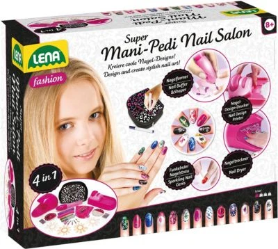 Der Mani-Pedi Nail Salon bietet viele Möglichkeiten in einer Faltschachtel. Das 4 in 1 Set beinhaltet einen Nagelformer mit 5 verschiedenen Aufsätzen. Mit dem Nagel-Design-Drucker können mit 48 verschiedenen Motiven und funkelnden Nagelstrass aufgehĂĽbscht werden. Der dazugehörige Nageltrockner trocknet die Nägel im Handzmdrehen, sodass die Nägel schnell gezeigt werden können.Â