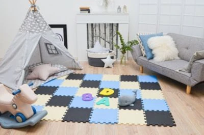 Nicht nur für Parkett – auch als Spielmatte auf Teppich: Die hochdichten EVA-Matten schützen Kleinkinder zuverlässig vor Hausstaub und Milben .