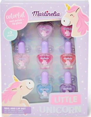 Das Martinelia Little Unicorn Nagellack-Set besteht aus fünf tollen Nagellacken mit coolem Glitzer! Auch zwei herzförmige Döschen Lipgloss sind mit dabei.