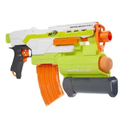 2-in-1 Darts und Raketen fĂĽr extra WummsHalbautomatisches Feuer wie eine Stryfe, auĂźergewöhnliches Magazin wie N-Strike Raider oder Elite Rampage und Raketenwerfer wie der Big Bad Bow- der Demolisher 2-in-1 erfĂĽllt den Zweck fĂĽr den man vorher viele unterschiedliche Modelle gebraucht hat und macht dabei noch eine verdammt gute Figur. Die Demolisher ist eines der Topmodelle aus der Elite Reihe im Jahr 2014, und setzt als erster Abkömmling der XD (eXtra Distance)-Reihe den gewohnten Top-Reichweiten noch was oben drauf. Damit sind nun bis zu 90 FuĂź Reichweite drin, was etwa 27 Metern entspricht. Wow! Das gelingt durch eine neue Federtechnologie, die einem Star dieses Pakets zu Gute kommt: Dem Magazin im Banana-Style. Doch damit nicht genug- unter dem Lauf befindet sich ein Raketenwerfer, der die neuen Elite Missile Raketen abfeuern kann. Die zusätzlich separat erhältlichen Raketen finden auch in der SchulterstĂĽtze Platz. Im Lieferumfang gibt’s den Demolisher Blaster, 10 Darts, 2 Raketen sowie Bananenmagazin und SchulterstĂĽtze.