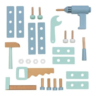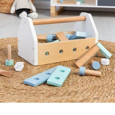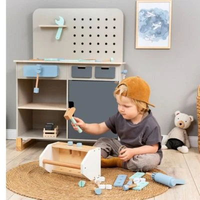 Auch im Kinderzimmer gibt es immer etwas zu reparieren. Da kommt die Werkzeugkiste Fagus von Musterkind gerade recht. Sie begeistert mit zahlreichen Accessoires wie Schraubenzieher, Säge, Bohrmaschine und vielem mehr. Werkzeugkiste Fagus von Musterkind 27-tlg. Werkzeugkasten mit Tragegriff und Löchern, Bohrmaschine, Hammer, Schraubendreher, 1 Maulschlüssel, 1 Säge, 1 Messwinkel, 4 Schrauben, 4 Muttern, 4 Nägel, 8 Verbindungsplatten 25(L) x 14(B) x 15(H) cm aus Holz ab 3 Jahren geeignet Eine Werkzeugkiste wie für Profis: Das Set ist in lässigem skandinavischem Design gehalten und mit zahlreichem Zubehör ausgestattet. Der robuste Werkzeugkasten ist mit einem praktischen Tragegriff versehen und auch für unterwegs geeignet. 27 Teile sorgen bei Minis sofort für große Begeisterung. In die seitlichen Löcher können die Schrauben mit dem Schraubenzieher eingedreht und mit den Muttern befestigt werden. Das Set beinhaltet zudem eine Bohrmaschine, einen Hammer und einen Maulschlüssel. Natürlich dürfen auch eine Säge, ein Messwinkel, Nägel und verschraubbare Verbindungsplatten nicht fehlen. So hat der Hobbyhandwerker immer alles parat, wenn Hilfe benötigt wird. Mit den Elementen des Sets trainieren Kids ihre motorischen Fähigkeiten. Zudem eignet sich die Werkzeugkiste ideal dafür, mit Geschwistern und Freunden zu spielen. Das umfangreiche Set ist für Kinder ab drei Jahren zu empfehlen.