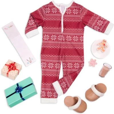 Inhalt: 1 Puppe, 1 Kleid, 1 Pyjama, 1 Strumpfhose, 1 Unterhose, 1 Paar Schuhe, 1 Paar Hausschuhe, 2 Kekse, 1 Kakao, 1 kleiner Teller, 1 Brief, 2 Geschenke