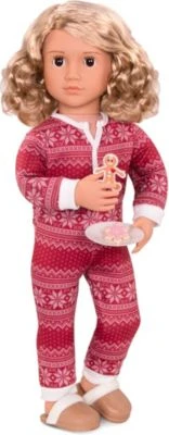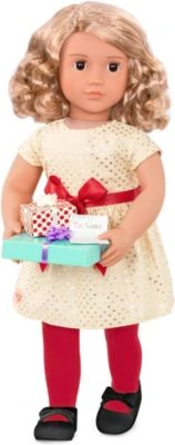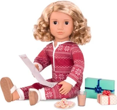 Diese wunderschöne Puppe mit braunen Augen und schulterlangen blonden Haaren trägt den bezaubernden Namen Noelle. Sie liebt es, Weihnachten zu feiern! In ihrem goldfarbenen Kleid sieht sie ganz besonders festlich aus, ehe sie sich abends in ihrem flauschig weichen Pyjama mit euch vor den Kamin kuschelt. Wenn ihr eng zusammenrückt, findet deine neue beste Freundin ganz bestimmt ihren neuen Lieblingsplatz in eurem Zuhause.