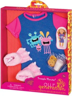 Monstermäßiges Outfit von Our Generation. Dieses Set begeistert mit einem coolen Longshirt mit Monsterprint. Passend dazu gibt es noch ein paar Hausschuhe in Krallenform und einen kleinen Mitternachtssnack aus Keksen und Milch. Jetzt heißt es aber schnell ins Bett, damit Püppi am Morgen fit und ausgeschlafen ist.