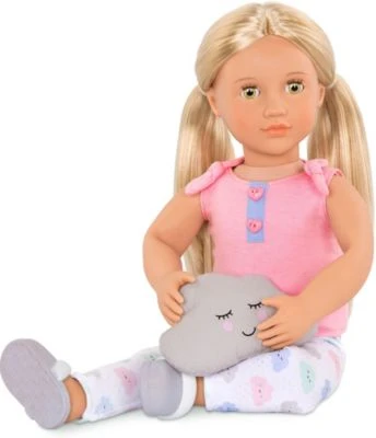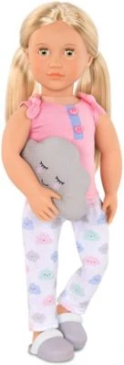 Auf geht es in das Land der Träume! Mit dem passenden Outfit schlummert das Puppenkind ganz schnell ein. Deshalb enthält diese Set von Our Genreration einen süßen Pyjama bestehend aus eine Leggins mit Wolkenprint und einem Top mit schicken Schleifen-Trägern. Passend dazu gibt es auch noch ein gemütliches paar Hausschuhe. Jetzt nur noch die Kuschelwolke in den Arm nehmen und die Äuglein fallen ganz schnell zu.