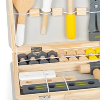 Highlights: – handlicher Koffer mit Klippverschluss und Tragegriff aus Holz – umfangreiche Spielmöglichkeiten fĂĽr unterwegs – werkstatttypische Farbgestaltung mit viel sichtbarem Holz – 6 Werkzeuge aus Holz (Hammer, SchraubenschlĂĽssel, Schraubendreher, Zange, Tischlerwinkel mit Wasserwaage, Akkuschrauber mit magnetischen Bits) – umfangreiches Zubehör aus Lochleisten, Schrauben und Muttern – flexible Gummibänder im Koffer halten das Werkzeug an Ort und Stelle