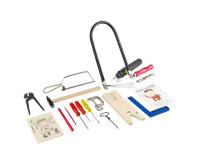 Laubsäge, Laubsägetischchen mit Einspannhalterung, Zwinge, Laubsägeblätter, Laubsägeschlüssel, Holzvorlage DIN A6 bedruckt, Stahlhammer, batteriebetriebene Bohrmaschine (Batterien nicht enthalten), Säge für Metall, Ahle, Rundfeile, Schraubendreher (Schlitz), Flachzange, Pinsel, Winkel, Nagelbohrer, Stift, Gebrauchsanweisung