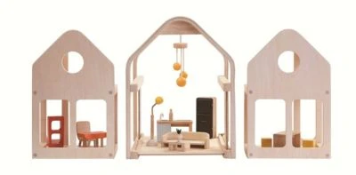 Gestalten deinen eigenes Haus mit diesem einzigartigen und kompakten Puppenhaus! Das Puppenhaus ist transportabel und bereits komplett montiert. Es besteht aus drei Einheiten, die durch Verschieben und Umstellen auf verschiedene Arten angeordnet werden können. Es verfügt über einen Kronleuchter, zwei Schiebetüren und moderne Möbel für ein Schlafzimmer, ein Wohnzimmer, ein Badezimmer, eine Küche und ein Esszimmer. (Enthält insgesamt 20 Teile)