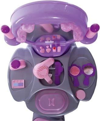 Altersempfehlung ab 3 Jahre Schminktisch mit Hocker beleuchteter Spiegel, hierfür werden 3 x AA 1,5 V Batterien benötigt (im Set enthalten) Ablagefächer kleiner Handspiegel Haartrockner Lippenstift drei Kosmetikbehälter zwei Armbänder Ohrringe Kamm aus hochwertigem Kunststoff