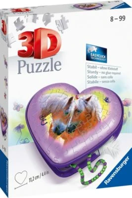 Das tolle 3D-Puzzle von Ravensburger ist perfekt für kleine Pferde-Fans! Das Puzzle ist super einfach zusammenzusetzen und hält dank Easyclick-Technologie sogar ohne Klebstoff. Das Puzzle kann dann in den Herzrahmen eingesetzt werden und ergibt eine wunderschöne Herzschatulle, in der Kinder ihre liebsten Schätze aufbewahren können.