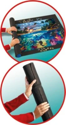 Roll your Puzzle! für 300 bis 1500 Teile von Ravensburger bietet eine Arbeitsfläche für Motive bis zu 1500 Teilen. Gepuzzelt wird direkt auf dem rutschfesten Filz. Zum Aufbewahren einfach das Puzzle um die hochwertige Röhre aus Kunststoff wickeln und mit den beiliegenden Gummibändern befestigen. Das Puzzle kann nun sicher und platzsparend weggestellt und aufbewahrt werden. Tipp: Bügeln Sie auf niedrigster Stufe die Knick-Falten aus dem Filz, damit die Unterlage möglichst glatt ist.