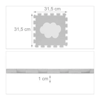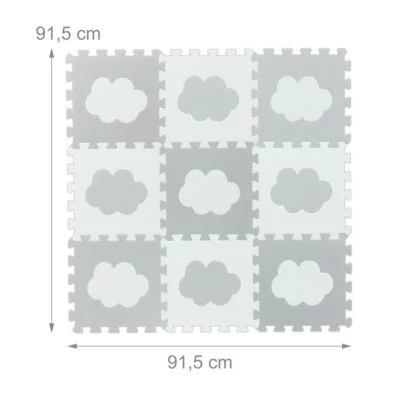 Spielspaß für die Kleinen garantiert die weiche Spielmatte zum Puzzeln. Der flexibel zusammensetzbare Puzzleteppich besteht aus 9 schadstofffreien Schaumstoffmatten, wobei das Wolken-Motiv zum fantasievollen Spiel einladen. Die pflegeleichte Krabbelmatte besitzt eine stoßdämpfende Wirkung und bietet eine wärmeisolierende Unterlage für das Spielen am Boden. Die Spielematte verfügt über aufstellbare Randstücke, die den Spielbereich eingrenzen und einen festen Rahmen zum Austoben schaffen.