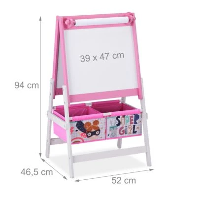 – Details: Kinder-Staffelei mit rosa Rahmen – HxBxT: ca. 94 x 52 x 46,5 cm – Tafel HxB: ca. 39 x 47 cm