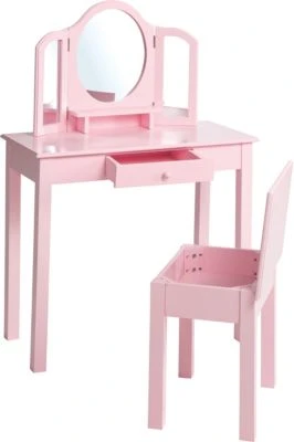 Früh übt sich, wer ein Meister sein will: dieser Schminktisch ist der ideale Platz für die tägliche Schönheitspflege. Er besteht aus stabilem MDF und ist mit drei Spiegelflächen ausgestattet, von denen sich zwei verstellen lassen. Der passende Hocker verfügt über ein Geheimfach unter der Sitzfläche.