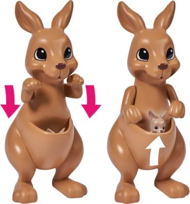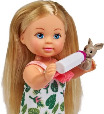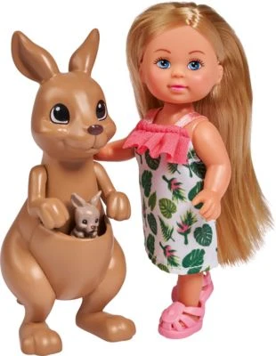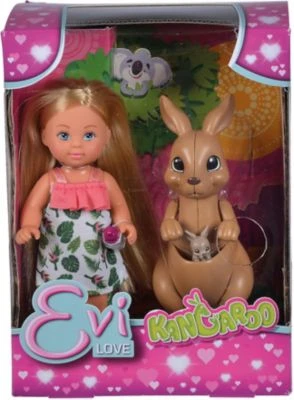 Evi Love, die kleine Schwester von Steffi Love, ist jetzt auch im Land der Koalabären unterwegs! Ausgestattet mit einem süßen Kleidchen mit Rüschen und passenden Schuhen freundet sie sich mit der Känguruh-Mutter und ihrem Kleinen an. Das Baby kann sich nicht nur lustig im Beutel verstecken und wieder hervorlugen, sondern auch von Evi mit dem Fläschchen gefüttert werden. Für tolle Rollenspiele!