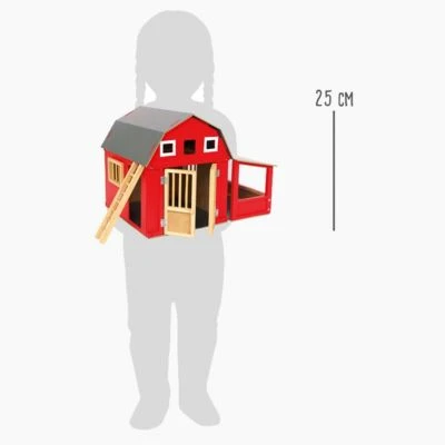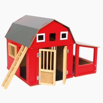 Pferdeliebhaber aufgepasst! Dieser kompakte Pferdestall lässt keine Wünsche offen. Die Scheune Alabama ist vom Design den US-Amerikanischen Pferdestallungen des mittleren Westens nachempfunden und bietet genug Höhe, um allen gängigen Spielfiguren Platz zu bieten. Die große rote Holzscheune hat einen geräumigen Vorbau und einen Heuboden, der über die beiliegende Leiter zu erreichen ist. Die Dachplatten der wunderschönen Spielscheune sind nicht verschraubt, sondern aufgesteckt, so dass sie leicht abgenommen werden können, um den Innenraum zu bespielen.