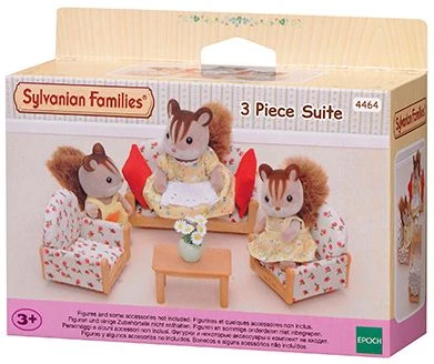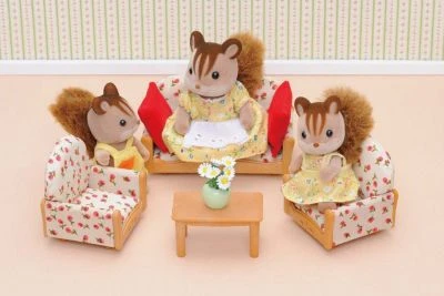 Diese hübsche Sitzgruppe passt in das Haus jeder Sylvanian Family: Eine gemütliche Couch und zwei Sessel zum Zurücklehnen und Entspannen, alles geschmückt mit einem frühlingshaften Blümchenmuster. Zwei rote Kissen können auf dem Sofa verteilt werden, falls jemand dort ein Nickerchen machen möchte. Auf dem Couchtisch steht eine Vase mit frischen Blumen. Hier kann sich eine Tierfamilie treffen, reden, lachen und spielen.