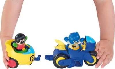Batman und Robin sind bereit die Welt zu retten! Mit dem Spieleset Batman 2-in-1 Batcycle von TOMY kommt Spielespaß für Superhelden-Fans in die Kinderzimmer. Das Bat Motorrad ist mit einem Rückzugsmotor ausgestattet und kann umgebaut werden: der Seitenwagen für Robin kann entweder an der Seite oder als Anhänger montiert werden. Los geht es zum Abenteuer-Einsatz.
