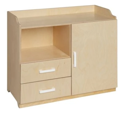 De commode bestaat uit een werkblad met fraai afgeronde hoeken, waar een aankleedkussen op past.