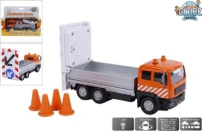 Der Van Manen Kids Globe Traffic Die Cast LKW (Pull Back) Signboard Truck ist ein Baustellen-Absicherungsfahrzeug, mit dem andere Verkehrsteilnehmer*innen gewarnt werden können. Die aufstellbare Warntafel ist mit einem blinkenden Pfeil ausgestattet, der durch einen Tastschalter an- und ausgeschaltet werden kann. Auch mit den vier Verkehrshütchen kann die Baustelle gesichert werden.