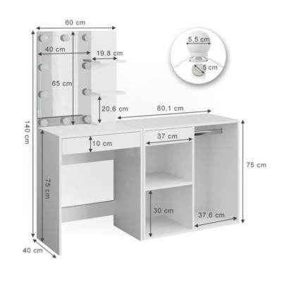 • Im Lieferumfang enthalten sind jeweils der Schminktisch, die Lichterkette, der Schubladenschrank, eine bebilderte Montageanleitung und das benötigte Montagematerial.